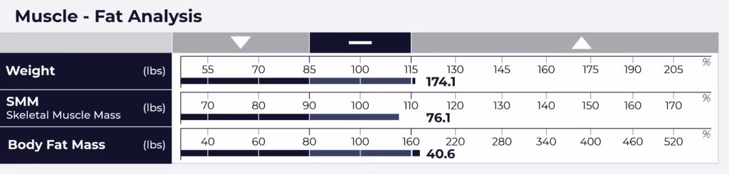 However, it doesn’t work the other way: an increase of Lean Body Mass is not always an increase in muscle. That’s because body water makes up a significant portion of your Lean Body Mass. To illustrate this point, here’s a body composition analysis of a 174.1-pound male.